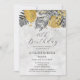 Elegant and chic tropical palm bridal shower invitation features a top arrangement of black line drawn palm leaves and gold textured foliage. The birthday heading is written in a modern and open script. A soft and romantic gray watercolor wash pulls the design together on the front and back. Very easy to customize. This item is part of the Elegant Tropical Palm collection. The timeless aesthetic makes this appropriate for any time of the year.