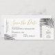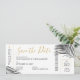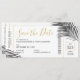 Tropische Palmen Blätter (Fronds) auf einem einfachen, modernen und minimalen Design-Boarding passieren Flugzeug-Ticket Save the Date Karte perfekt für eine Strandhochzeit oder tropische Insel Hochzeit in Urlaubsort mit einem schicken Retro-modernen Schwarz-Weiß-Karte mit goldener Farbe Thema ästhetisch. Alle Texte können personalisiert sein, sowie die Text- und Hintergrundfarbe. Klicken Sie auf Weiter, um dies im erweiterten Editor zu tun.