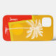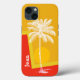 Stilvolles iPhone Gehäuse, mit einer Palmengrafik über einem orangen und gelben abstrakten Sonnenaufgang. Personalisieren Sie den Text für sich selbst oder als großartige Geschenkidee.
