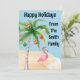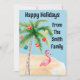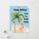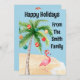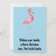 Dekorierte Weihnachtspalme und ein Flamingo in einer Weihnachtsmannmütze auf Weihnachtskarte. Personalisieren Sie mit Ihrem Namen und Gruß.