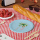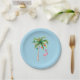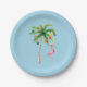 Dekorierte Weihnachtspalme und ein Flamingo in einer Weihnachtsmannmütze am Strand Teller für Ihre tropische Feier.