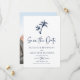 Diese einfache, minimalistische, tropische Hochzeitskarte Save the Date mit zwei Palmen am oberen Ende, mit klassisch elegantem Text, in einem weißen und marineblauen Farbschema, mit einer Fotovorlage auf der Rückseite.