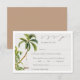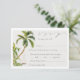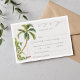 Diese Hochzeitskarte ist ein tropisches Dschungeldesign mit den Farben der Natur. Es verfügt über Palmen, üppige Regenwälder und Bungalows, die in einem schönen tropischen Paradies eingebettet sind.