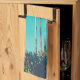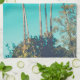 Küchentuch mit einem schönen Foto. Große Palmen mit langen schmalen Stämmen vor einem schönen grünen Himmel. Retro-Farbschema. Entspannen und kühlen.
