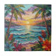 Pretty tile with a gorgeous ai impasto oil painting style illustration of the blue ocean, a sandy beach surrounded by palm trees at sunset.