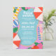 Farbenfrohe, moderne und trendige Sommerdusche. Die Einzelheiten des Brautparty sind auf dem blauen Wasser des Pools in weißem Text vermerkt. Die Luftansicht zeigt die Sonnenbäder am Pool, die rot-weißen Sonnenschirme, die Beachbälle, die tropischen Blume und die Blätter aus Palmen. Rosa und weiße Kacheln bilden den Hintergrund. Dieses Element ist Teil der Brautparty Pool Party Sammlung.