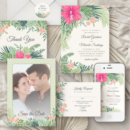 Erleben Sie einen Tag im Paradies mit diesem tropischen Retro-Design. Mit tropischen Blätter und Blume in Rosa, Orangen und Grüntönen und einem stilisierten Rattanmuster auf der Rückseite erinnert dieses Design an ein lustiges, sonniges Ti-Party oder Luau. Ideal für Ihre lässige Strandangelegenheit, das Party am Wilden Pool oder die Feierlichkeiten in den Tropen. Bestellen Sie noch heute die Kollektion für passende Schreibwaren und sagen Sie "Aloha" zum perfekten Tag!