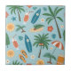 Bright tropical pattern ceramic tile featuring palm trees, surfboards, citrus slices, flip flops, and fruity drinks in a fun summer-inspired style. Ideal for beach lovers, surfers, vacation fans, and anyone who loves colorful tropical aesthetics.