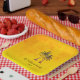 Tropical Bright Gold Party Papiertüte, mit einer Palmenblüte Design und schwarz anpassbare Schrift. Ideal für die Planung Ihres sommerlichen Picknick-Party mit einem Thema Strand.