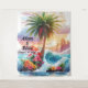 Set the scene for a sun-soaked celebration with this vibrant, customizable wedding backdrop. A striking palm tree stands at the center, surrounded by bold tropical florals in fiery shades of red, orange, and fuchsia. In the distance, lush mountains rise against a sunset-painted sky while ocean waves crash over rocky shores, creating a dynamic and romantic ambiance. Perfect for beach, destination, or summer-themed weddings, this backdrop includes a personalized name and date section, making it a dazzling focal point for your tropical "I do."