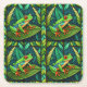 Tropical-themed coasters with vibrant green leaves and colorful red-eyed tree frogs. The design is lively and playful, with a lush jungle feel.