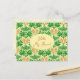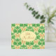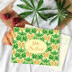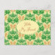 Postcard for friendship. Send a greeting to a penpal with this tropical vibe postcard. "Hello my friend" on the front is easy to change to your preferred greeting. Green fronds and palm 'flowers' make up this ogee style repeating pattern on a sunny yellow background. Palm flowers hang in clumps from a separate sheath that opens to reveal branched clusters of tiny flowers that often become berries, depending on the type of palm. In this hand-drawn design the flowers are yellow with orange to orange-red colors. They hang between the fan-like leaves. The design is printed on both sides of this penpal postcard.