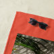 Fühlen Sie sich wie in den Tropen, mit diesem farbenfrohen, orangefarbenen Badetuch, das mit einem Hibiskus, einem Strohhut und Schatten von Palmenfronten auf den Sand gegossen wird. Dieses Bild ist eine originelle Strandfotografie von JLW_FOTOGRAFIE.