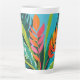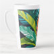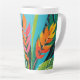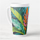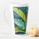 Dieses Design zeichnet die üppige Schönheit des tropischen Blattwerks auf kühne, stilisierte Weise aus. Die Komposition zeichnet sich durch eine auffallende Anordnung verschiedener Blätter der Pflanze aus, darunter breite Monstera-Blätter, schlanke Palmenfronten und lebhafte Helikonien. Die Farbpalette ist reich und auffällig, mit Grüntönen von Limon bis smaragdfarben, die von hellen Orangen, Gelb und Rosa geprägt sind.