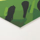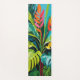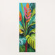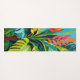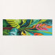 Dieses Design zeichnet die üppige Schönheit des tropischen Blattwerks auf kühne, stilisierte Weise aus. Die Komposition zeichnet sich durch eine auffallende Anordnung verschiedener Blätter der Pflanze aus, darunter breite Monstera-Blätter, schlanke Palmenfronten und lebhafte Helikonien. Die Farbpalette ist reich und auffällig, mit Grüntönen von Limon bis smaragdfarben, die von hellen Orangen, Gelb und Rosa geprägt sind.