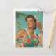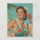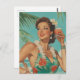 Eine glamouröse Frau in einem Blumenkleid und Hawaiian lei genießen einen Cocktail unter Palmen, strahlt Retro-Insel Charme und Urlaubsstimmung aus.