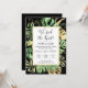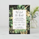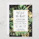 Dieses elegante tropische Empfang lädt mit grünen und goldgelben Palmen, Philodendron und Farn-Blätter auf schwarzem Hintergrund zum Verweilen ein. Ein eleganter Goldrahmen hebt den schwarzen Text hervor. Gold-Spritzer unterstreichen dieses exotische botanische Design und bringen ein bisschen moderne Laune in die Einladung. "Wir haben den Knoten getippt! " zusammen mit den Namen der Braut und des Bräutigams sind oben aufgeführt. Details zum Hochzeitssegment und den Ort und das Datum des Empfangs sind unten beschrieben. UAWG Informationen finden sich auf der Rückseite der Einladung.