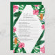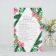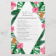 Tropical Palms Watercolor Bridal Dusche Einladung. Das Design besticht durch ein elegantes Bouquet mit klassischen Strandfarben und Blume, darunter rosafarbener Hibiskus, orangefarbene und blaue Paradiesvögel, grüne Vegetation und dunkelgrünes Palmenblatt.