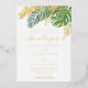 Diese elegante Hochzeitseinladung besticht durch ein Aquarelldesign üppiger tropischer Blätter in Grüntönen. Die Blätter sind mit einer Goldfolie versehen, die eine Touch Luxus verleiht. Der Text ist in einem stilvollen Schriftart mit Goldfolie-Kalligraphie gedruckt, der leicht vor weißem Hintergrund zu lesen ist. Diese Einladung ist ideal für eine Hochzeit oder eine Hochzeit in Urlaubsort in einem tropischen Ort.