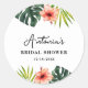 Klassischer Hochzeitsdusche-Aufkleber, verziert mit Wasserfarbe-Tropenmotiven: Monstera-Blatt, Palmblatt und Hibiskus-Blüte. Passen Sie die Aufkleber mit Ihren Details für Ihren Dusche-Tag an. Es ist einfach und das Ergebnis ist sofort auf dem Bildschirm sichtbar.