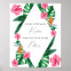 Tropical Palms Watercolor Bridal Dusche Einladung. Das Design besticht durch ein elegantes Bouquet mit klassischen Strandfarben und Blume, darunter rosafarbener Hibiskus, orangefarbene und blaue Paradiesvögel, grüne Vegetation und dunkelgrünes Palmenblatt.