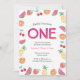 Eine tropische 1. Geburtstagsfeier für Ihre Kleine! Diese zauberhafte fruchtig-rosa Geburtstagseinladung beinhaltet ein Aquarellfrucht mit Ananas, Wassermelonen, Orangen, Kirschen und Erdbeeren. Alle Details inklusive (außer Alter) sind anpassbar. Auch andere Altersgruppen sind in dieser Sammlung verfügbar.