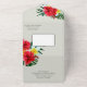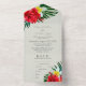 Diese Einladung zur Hochzeit bietet ein All-in-One-Design mit einer R.S.V.P.-Karte, die am Ende enthalten ist. Der Hintergrund ist ein elegantes Weissgrün mit bunten, tropischen hawaiianischen Blume. Blumenstrauß mit Palmenbouquets, Hibiskus und Frangipani-Blume prägen die Ränder.