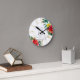 Diese benutzerdefinierte Wanduhr bietet ein tropisches Strand oder Insel Hochzeitsthema. Der Hintergrund ist schlicht und elegant mit bunten, tropischen hawaiianischen Blume. Blumenstrauß mit Palmenbouquets, Hibiskus und Frangipani-Blume prägen die Ränder.