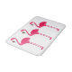 Diese lustige Badematte verfügt über drei niedliche rosa Flamingos auf einem massiven weißen Hintergrund.