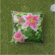 Ein tropisches Ambiente mit Blumenkissen. Dieses Kissen ist mit einem rosafarbenen Lilienmuster mit grünen Blätter im Hintergrund ausgestattet. Benutzen Sie dieses Kissen, um Ihr Wohnzimmer im Freien zu betonen. Dieses Kissen wird das Ambiente des Innenhofs verleihen. Kaufen Sie wie gezeigt oder anpassen mit Ihrem eigenen Foto.