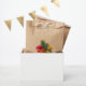 Tropische Snack-Tasche mit individuellem Text, für ein Wochenende Hochzeitsempfang für die Gäste. Die dekorierte Tasche ist in einem Geschenkkorb für die Gäste an einer Hochzeit in Urlaubsort in einer tropischen Lage.