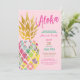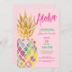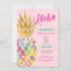 Tropische Ananas-Brautparty-Einladung. Aloha. Tropisches Party. Sommer hawaiisches Laua Blätter. Gold und bunte Ananas. Für weitere Kundenbezogenheit klicken Sie bitte "besonders anfertigen es" Knopf und benutzen unser Entwurfswerkzeug, um diese Schablone zu ändern.