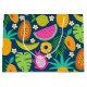 Niedliche, lebendige tropische Früchte mit Ananas, Papaya, Drachenfrucht, Mango, Banane, Wassermelone und Zitrone mit tropischen Blätter im dunklen Hintergrund