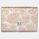 Tropische Blätter aus Pfirsich und Gold und Mongramm werfen Decken. Dieses Design zeigt Blätter von Split Leaf Philodendron (Monstera deliciosa) oder Schweizer Käse Pflanze und Palmen Blätter in Pfirsich mit goldener Kontur und Ihr Monogramm in schwarz.