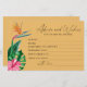 Diese farbenfrohe tropische Blumen und tropische Farbe Hintergrund Brautdusche Einladung. Das Design besticht durch ein elegantes Bouquet mit klassischen Strandfarben und Blume, darunter rosafarbener Hibiskus, orangefarbene und blaue Paradiesvögel, grüne Vegetation und dunkelgrünes Palmenblatt.