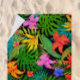 Ein lebendiger tropischer Druck mit tropischen Blume und Blätter aus Palmen auf schwarzem Hintergrund. Die Farbtöne lila, türkis, orange, grün und schwarz.