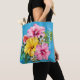Personalisierte Tragetasche mit großem Blumenmuster. Gesamtdruck mit rosa und gelben Hibiskusblumen. Weitere kleine Blumen und Blätter bilden dieses hübsche Design, das einen Hintergrund aus blauem Holzkorn hat. Ein Name wird auf der Vorderseite in eleganter Schreibschriftart hinzugefügt. Diese Tragetasche ist gefüttert und gibt es auch als Umhängetasche mit Trennern im Inneren. Diese große Tragetasche wäre ein wunderbares Geschenk für Mitglieder der Hochzeitsgesellschaft.