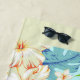 Schöne Blume und große tropische Blätter sind das Hauptmerkmal dieses Strandtuchdesigns. Die obere und untere Grenze sind weich gelb grün.