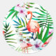 Ein tropisches Design-Kunstwerk aus einem rosa Flamingo und grünen tropischen Dschungel-Pflanze mit Hibiskus Blume und Palmen vor einem neutralen weißen Hintergrund. Ein lustiges und farbenfrohes Kunstwerk.
