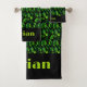 Große, tropische, grüne Blätter, die dem Monstera-Blätterdach ähneln, bilden ein wunderschönes Set für Badehandtücher. Personalisieren Sie Ihren Namen in hellgrünem Text auf schwarzem Hintergrund.