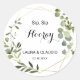 Dieses tropische grüne Blätter schlürfen stündlich Hochzeit klassischen Rundaufkleber ist perfekt für eine einfache Hochzeit. Das Design besticht durch handbemalte grüne Blätter, die einen goldenen geometrischen Rahmen schmücken.