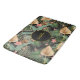 Moderne tropische Palmenpalmen Blätter und Hibiskus Blume grün und bräunlich auf schwarzen Badematte mit einer stilvollen Skriptsignatur. Ein stilvolles tropisches Thema mit einem Flüstern aus goldenem Glitzer, das im Design bespritzen ist. Grün, braun, ocker und korallenrosa auf schwarz. Der exotische erdhawaiische Stil.