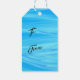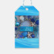 Weihnachten am Meer! Fügen Sie diesen atemberaubenden, an der Küste inspiriert Geschenktag zu Ihren Urlaubspaketen mit tropischem Thema hinzu. Das Foto auf dem Geschenkschild zeigt Seesterne, gestreifte Fische, Seepferd, Muscheln, Korallen und Zierbälle in verschiedenen Silber-, Blau- und Weißtönen. Die Tafel lautet "Seas 'n Greetings". Geschenkmarken verkauft in Sets von 10. Fotografie von Glenda Motsavage, einer Reiseautorin und -autorin aus Florida. Bild aus Orlando Museum of Art, Festival of Trees.