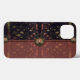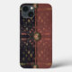 Alte Welt europäisch, exotisch und dunkel, mit einem leichten Geschmack des Orients, das schöne Muster von ZoeSPEAK, in natürlichen Farben auf diesem iPhone 13 Case, wurde aus Zoes Original Foto von Schmiedeeisen Latticework und tropischen Druckgewebe gemacht. Palmfronten und andere tropische Blätter, in blassfarbenen Grüntönen, Terrakotta und Beige, Erholung anmutig auf schwarzem Hintergrund hinter dem Gitterwerk. Das Design ist im Stil eines Kupplungssacks oder einer Handtasche, mit einem Blumenmedallion-Knopfverschluss auf dunklem Hintergrund, glatter Stoffklappe über einem verblassten bordeauxfarbenen Gewebe des gleichen Musters. Die Klappe ist mit einem lachsfarbenen Kornbänder überzogen.