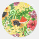 Tropische Michfrüchte, Blume und Blätter auf Gelb Runder Aufkleber