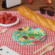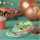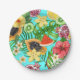 Tropische Mischfrüchte, Blume und Blätter auf blau Pappteller
