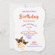 Hübsche, elegante Einladungen zum Geburtstag mit wunderschönen tropischen Schmetterlingen in Flight und stilvollen Script-Schriftart in lila, orangefarbenen Tönen. Ein weibliches Aussehen, das sowohl bei jungen als auch bei alten Frauen beliebt ist und so einfach mit Ihren persönlichen Geburtstagsdetails angepasst werden kann