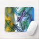 Tropische Stimmung mit zeichnend Aquarellkunst aus grünem Blatt und blauem und ockerfarbenem Hintergrund.