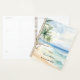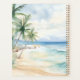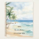 Eine tropische Strandlandschaft mit Wasserfarben. Sandstrand, Meereswellen und Palmen. Personalisieren und hinzufügen von Jahr, Name und Text.