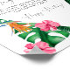 Tropical Palms Watercolor Bridal Dusche Einladung. Das Design besticht durch ein elegantes Bouquet mit klassischen Strandfarben und Blume, darunter rosafarbener Hibiskus, orangefarbene und blaue Paradiesvögel, grüne Vegetation und dunkelgrünes Palmenblatt.